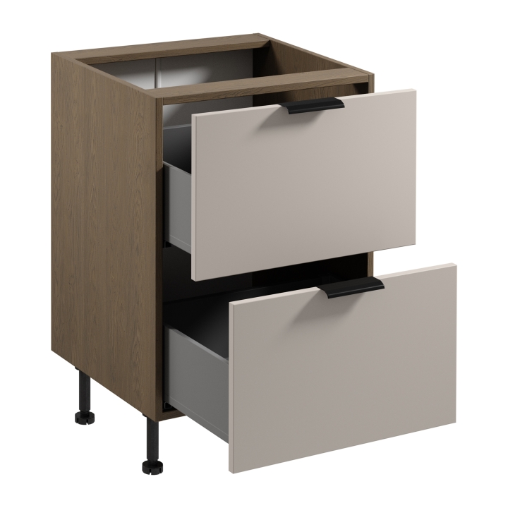 The Sorento D60S2 AX base kitchen cabinet is a built-in base unit that offers solid workmanship and convenient storage solutions. Designed with everyday use in mind, it features two full-extension drawers, making it much easier to access the contents and helping to organise the kitchen space. Each drawer can be loaded with up to 40 kg, making it possible to store heavier items without any problems.