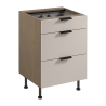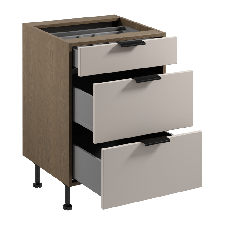 The Sorento D60S3 AX base kitchen cabinet is a solid built-in piece that provides comfortable storage and works well in both smaller and larger kitchens. This model features three capacious drawers mounted on full-extension slides, ensuring easy access to the entire contents without having to bend over or remove items from the front. The top drawer has a cutlery insert to organise small kitchen accessories and keep the inside tidy.