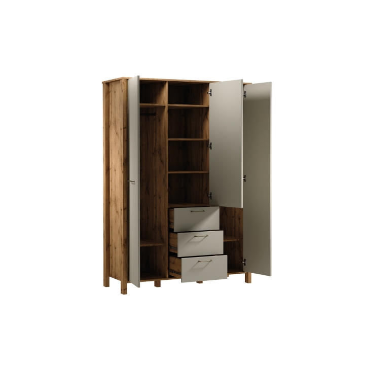 The furniturebody is finished in a warm shade of Wotan Oak, which contrasts with the monochromatic beige fronts to create a coherent and harmonious design. Being made of laminated board, which is resistant to damage, guarantees the durability and longevity of the wardrobe.