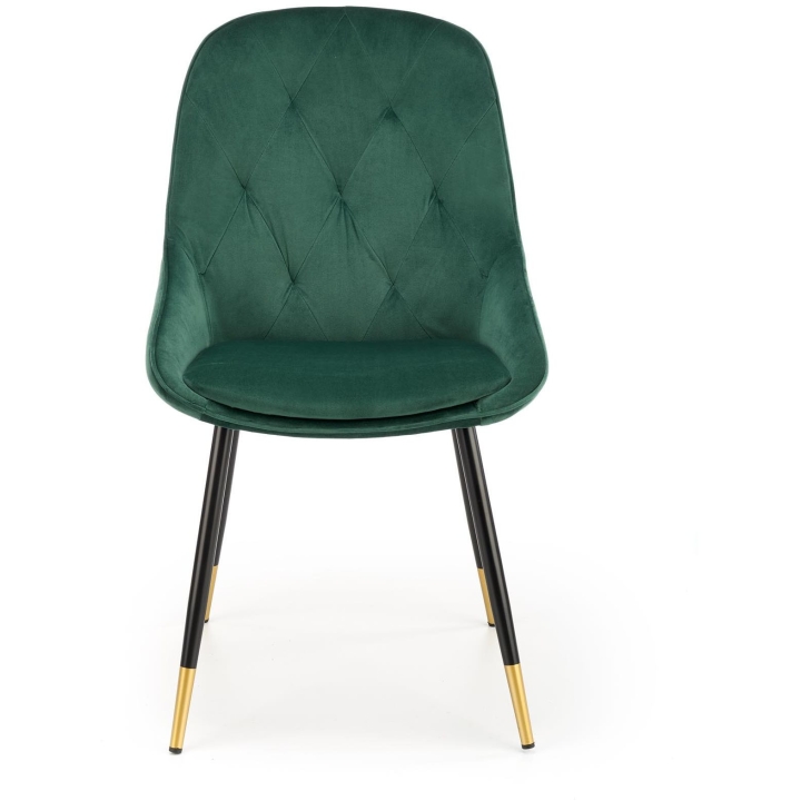 Design: dark green fabric, black powder coated steel legs with gold finish.