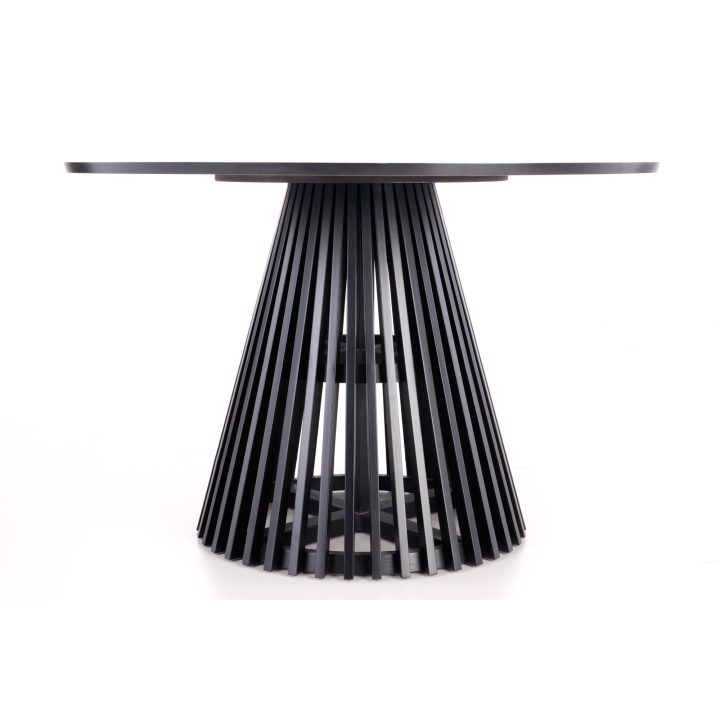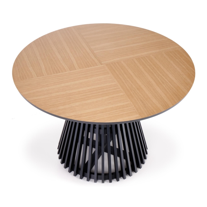 The Miyaki table from manufacturer Halmar is the perfect choice for those who appreciate modern design and natural materials. The round top with a diameter of 120 cm is made of MDF, covered with natural oak veneer, which gives it an elegant and durable look. The natural oak is distinguished by its beautiful grain, bringing warmth and cosiness to any interior. The legs of the Miyaki table are made of solid beech wood and plywood, painted in classic black to create a stylish contrast with the top. The black base adds a modern touch and makes the table fit perfectly into both minimalist and industrial settings. The table with black lamella leg is the latest trend of the season! Thanks to solid materials such as natural oak veneer and beech wood, the Miyaki table ensures durability and strength for many years. Its versatile style makes it perfect for the dining room, living room or office space.