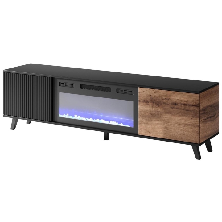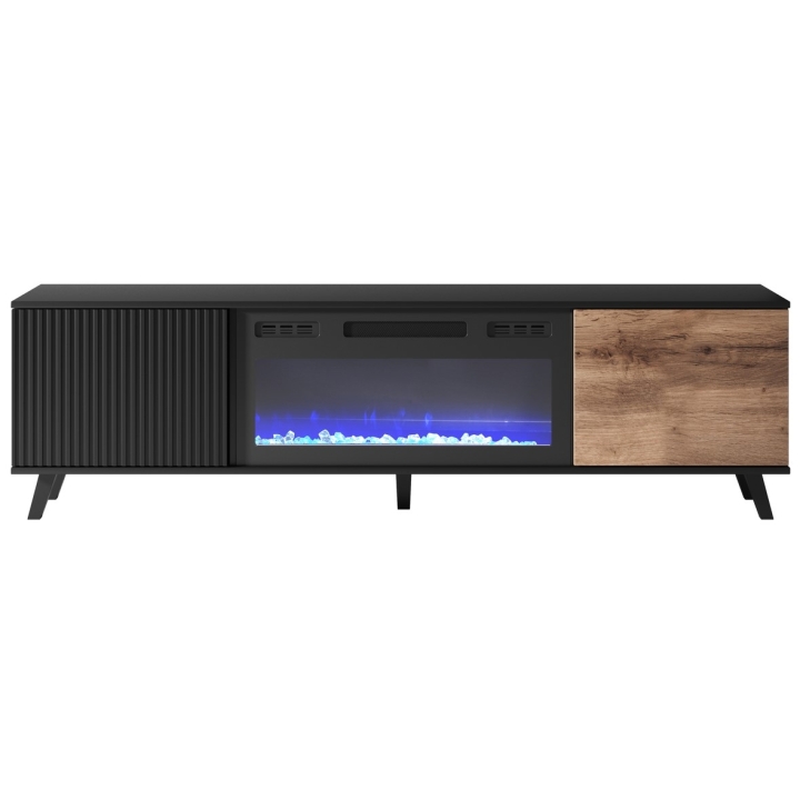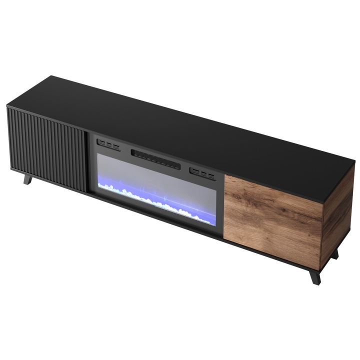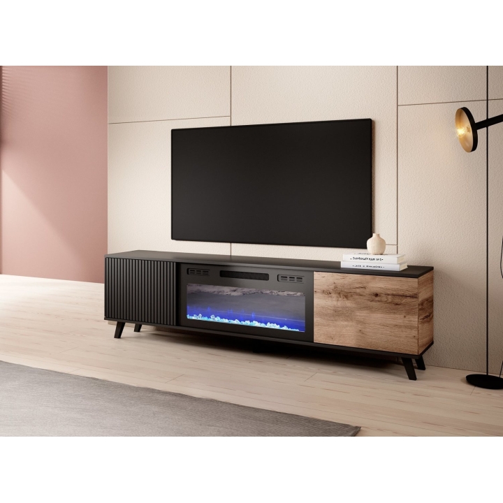 A distinguishing feature of this table is the built-in fireplace, which not only adds charm but also creates a pleasant atmosphere. The fireplace imitates a natural fire, making it an integral part of cosy evenings. Two closed shelves provide convenient storage space for electronic devices, while the various fronts - matte black with fluting and wotan oak - allow the style to be tailored to individual needs.