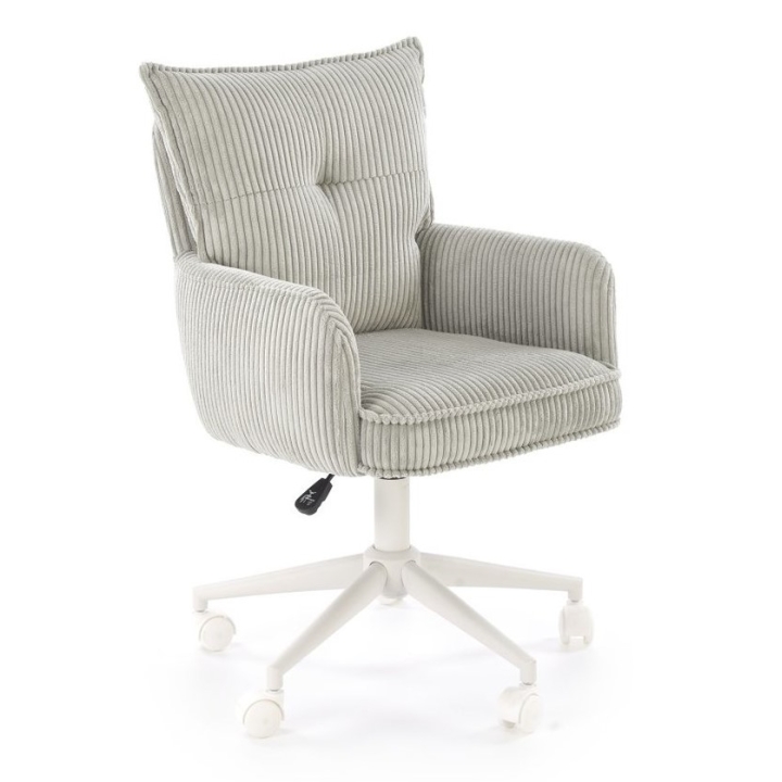 Dumbo Halmar swivel armchair in light ash colour with the following dimensions: width 52 cm, depth 58 cm, height 84-92 cm , is a modern model ideal for the office, study and youth room. Covered in soft fabric with a corduroy texture, it provides comfort during everyday use. The wide seat with armrests and comfortable wide backrest allow for comfortable use. Seat height adjustment in the range of 46-54 cm makes it possible to adjust the chair to different desks.