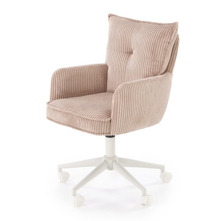The swivel seat and soft upholstery ensure comfort while working and studying. The corduroy fabric accentuates the modern look, while the white frame blends perfectly with bright interiors.