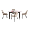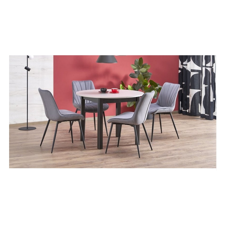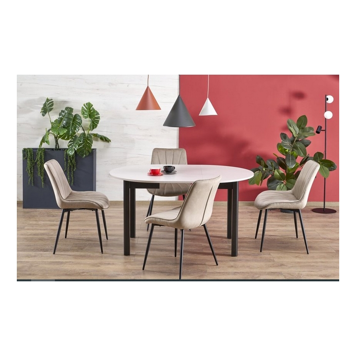 Ringo table by Halmar is a cashmere table for 4-5 people with a modern look, ideal for small spaces. Its modern design and careful workmanship make it an attractive piece of interior furnishings. Great for the dining room, kitchen or living room. Ringo table has a folding mechanism that allows you to increase the surface of the table top with an additional 40 cm long insert. This insert is not retractable under the top, which should be taken into account when planning the space. Its 102 cm diameter circular top reaches a length of 142 cm when unfolded, allowing 4 to 6 people to use it comfortably. Thanks to its round shape without sharp edges, it is safe for families with children. In the version with a cashmere-coloured top and black legs, it presents an elegant design that fits into many interior settings.The table top is made of high-quality MDF laminated board, ensuring durability and ease of cleaning. The table's legs, also made of MDF, guarantee the stability of the structure.The table is delivered in packages for self-assembly, but thanks to the clear instructions it is easy to do.