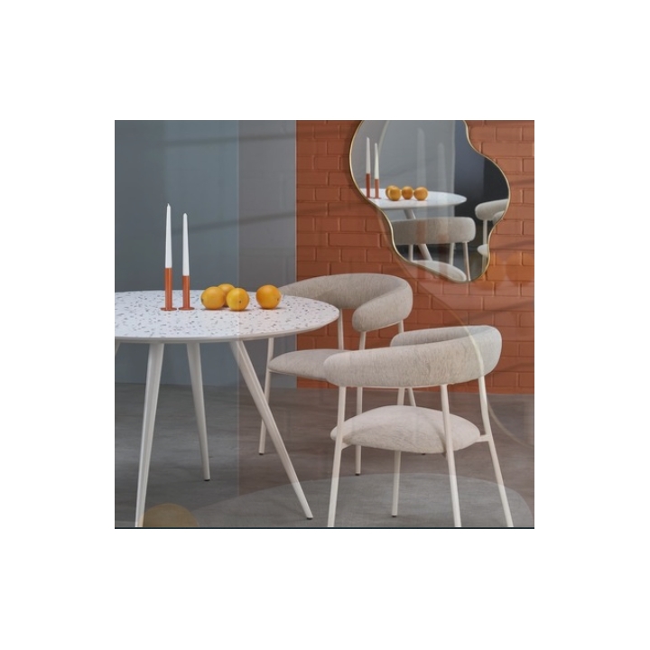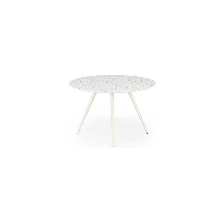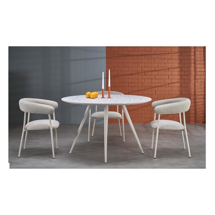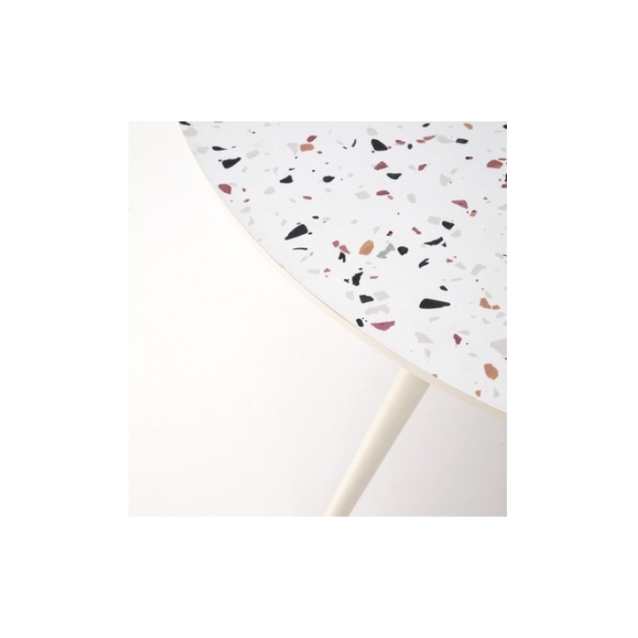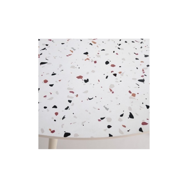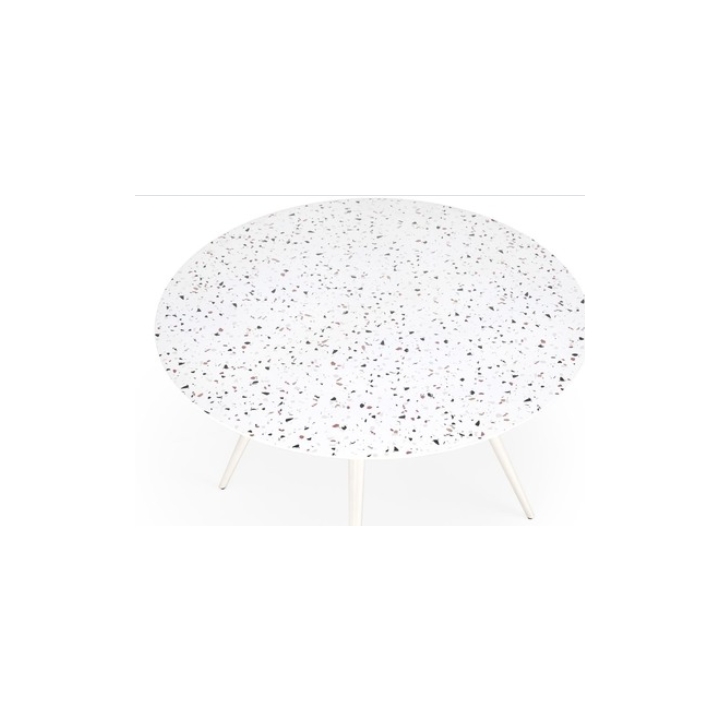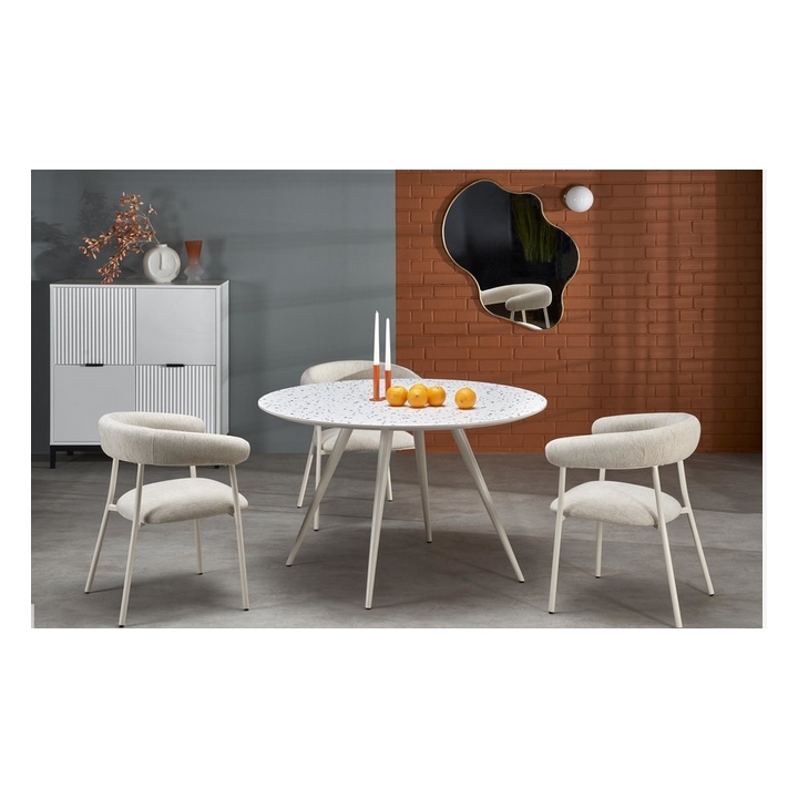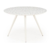 Aramis round table Bring a breath of freshness and elegance to your interior with the Aramis round table! Its all-white colour scheme adds a light and modern touch, blending perfectly with a variety of settings. Sturdy metal legs powder-coated in white guarantee durability and solidity of the structure. The table top made of MDF board covered with an HPL layer in the fashionable colour of white terrazzo is not only aesthetically pleasing, but also a practical solution - resistant to everyday use, easy to clean and extremely stylish.