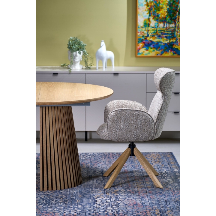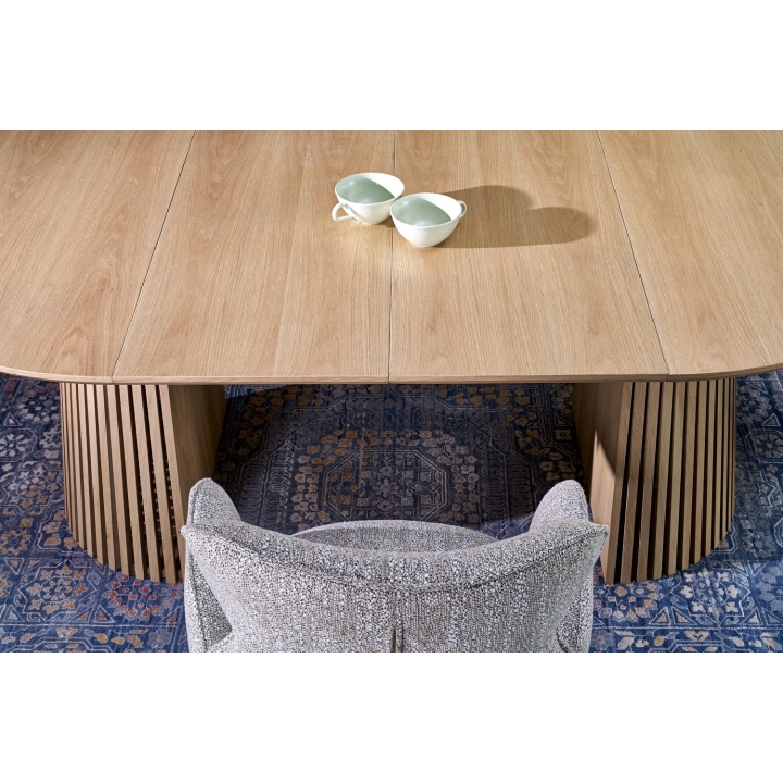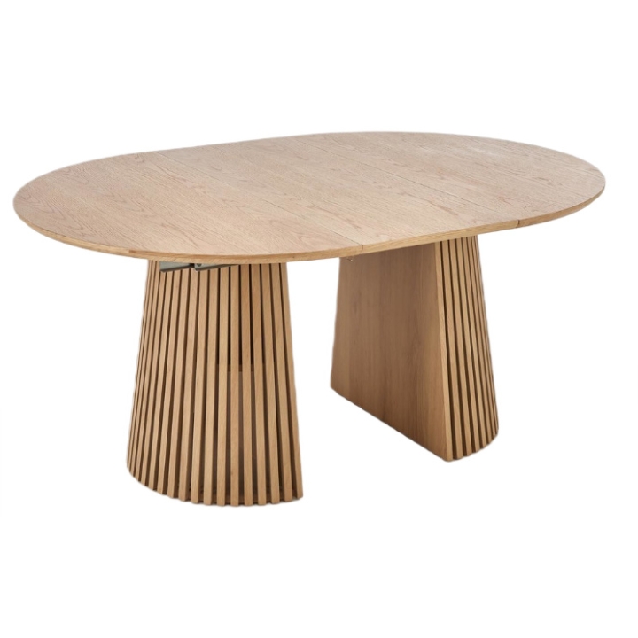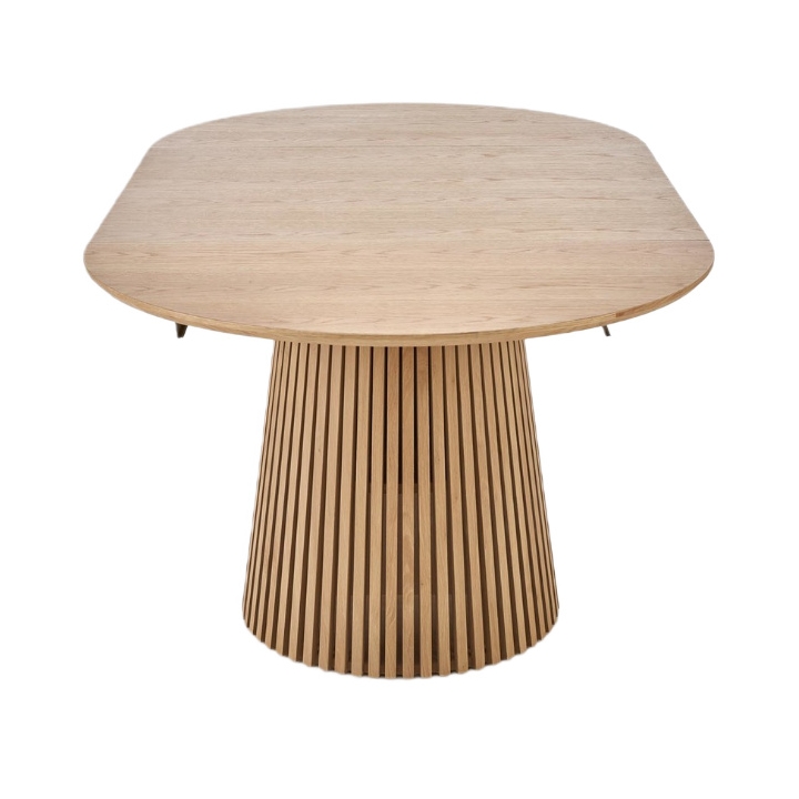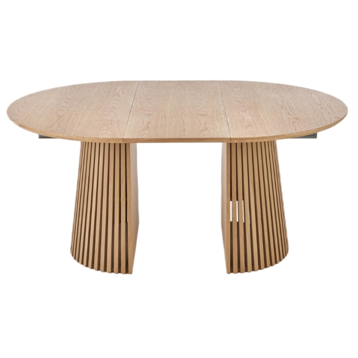 The table is made from durable MDF covered with natural veneer, ensuring strength, durability, and resistance to everyday wear. A distinctive feature of the Fargo model is its base made of vertical wooden lamellas, which adds a decorative architectural element while maintaining visual lightness.