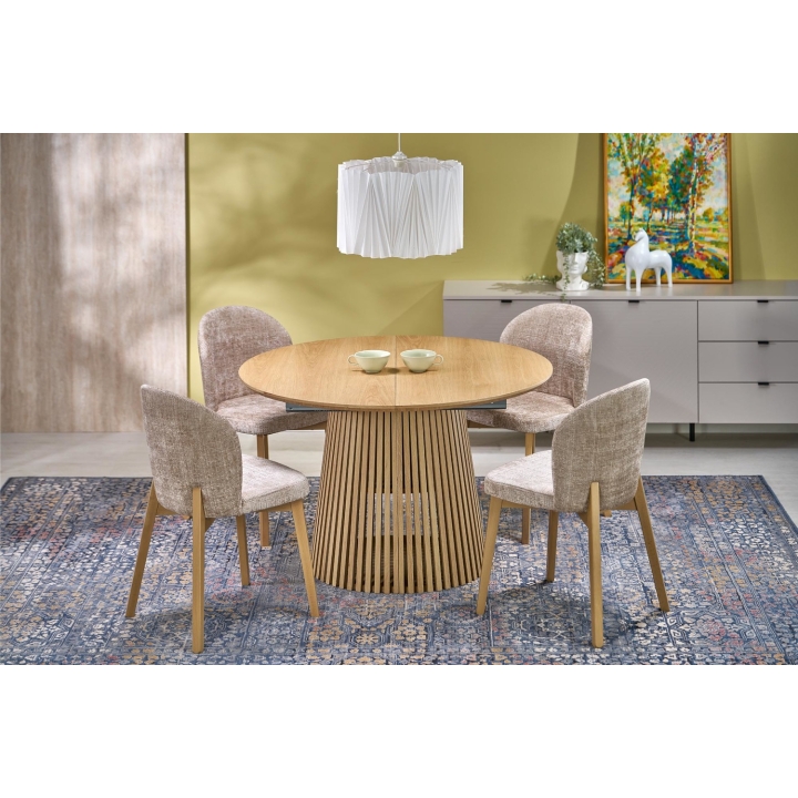 The Fargo dining table combines a compact round design with an extendable function, making it a practical solution for modern homes. In its standard configuration, the table features a round tabletop with a diameter of 120 cm, comfortably accommodating four people for everyday dining.