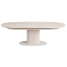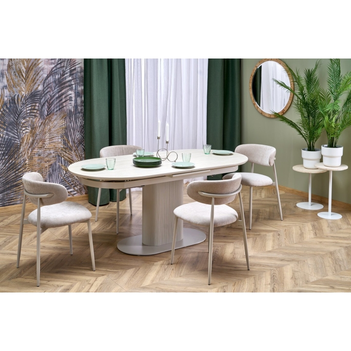 The construction combines modern materials with a soft, neutral colour palette that enhances the room without visually dominating it. The tabletop is made from sintered stone in a light travertine shade, offering a surface that is both durable and easy to maintain while maintaining a natural stone-like aesthetic.