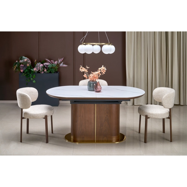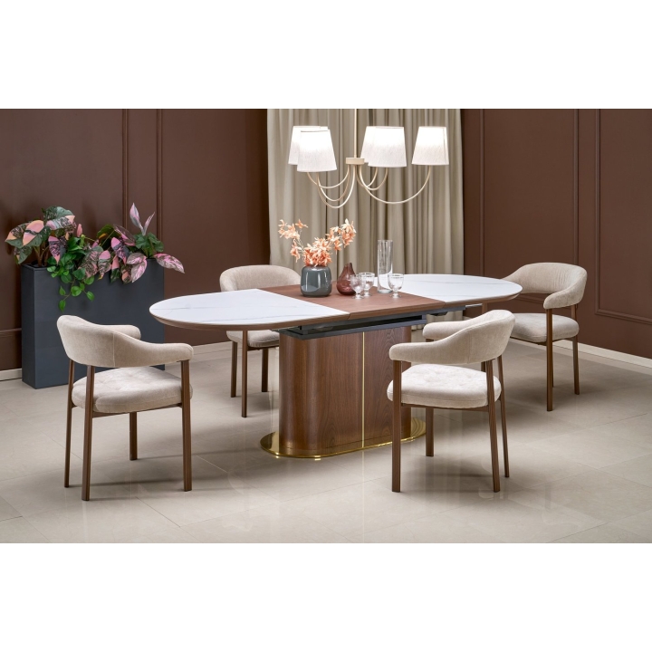 The table’s modern character is further emphasised by gold decorative accents integrated into the base design, which complement the walnut finish and add a refined touch. The central column base also ensures greater comfort for users, allowing chairs to be placed freely around the table without obstruction.