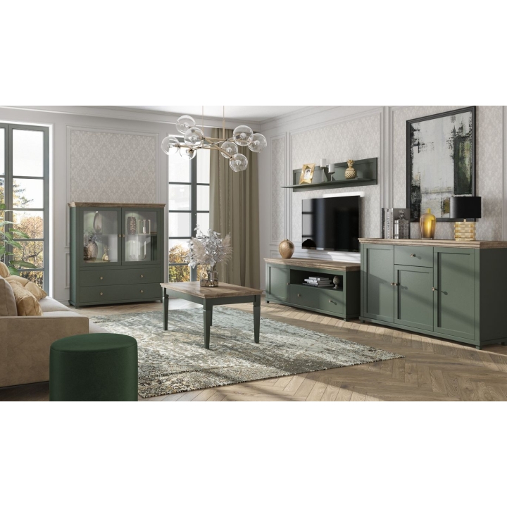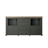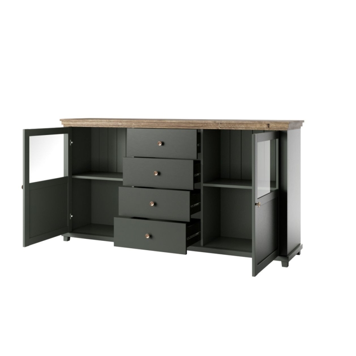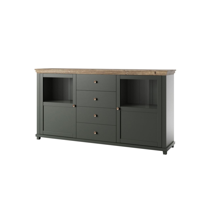 TheEvora chest of drawers from the Helvetia manufacturer will perfectly complement the interior of your living room. The furniture was made in a classic style. An incredible breath of modernity is added by oak accents used in the construction. The beautiful brass handles perfectly match the unusual colour of the chest of drawers. The central part of the furniture features as many as four drawers, which are perfect for storing important documents and photos collected over the years. On either side are two lockable cabinets with glazing allowing fashionable trinkets to be displayed. The body of the chest of drawers is made of scratch-resistant furniture board. An ideal choice to fill the empty space on the wall above the chest of drawers will be the shelf, which you can buy from the same collection. Optional LED lighting Alabama 2400AO02.