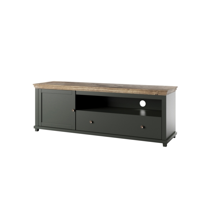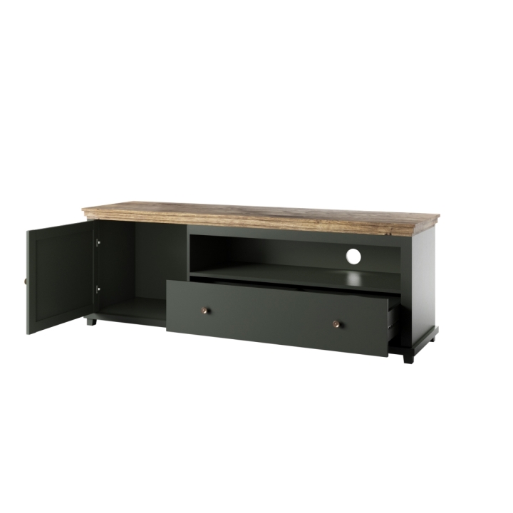 The Type 40 RTV chest of drawers from the Evora collection by the manufacturer Helvetia Wieruszów will be perfect as a place for your TV. The furniture was designed for lovers of classics, with a touch of modern accents at the same time. The chest of drawers has an open shelf, which will accommodate all your electrical appliances connected to the TV, and at the same time provide them with the necessary air circulation through the ventilation hole in the back. In the lower part of the furniture you will find a capacious drawer ideal for magazines or storing your laptop. A lockable cabinet located on the left side of the structure will accommodate your entire collection of DVDs of your favourite productions. The body of the furniture was made of scratch-resistant furniture board. A characteristic element of the furniture is the beautiful brass handles which perfectly blend into the whole. Optional Alabama 2400AO01 lighting.