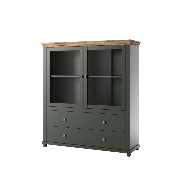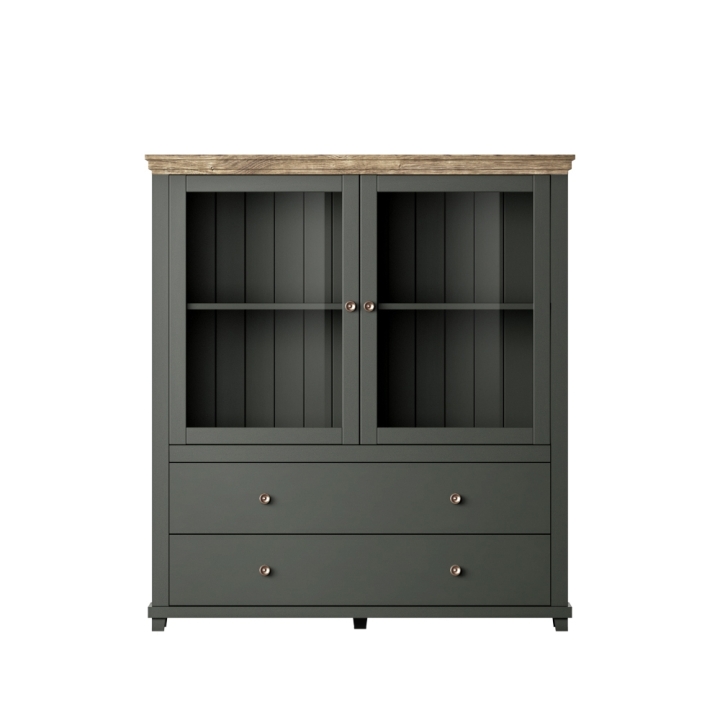 TheEvora tall chest of drawers by Helvetia is a perfect complement to your living room interior. The furniture was made with classical arrangements in mind, but modern accents were also applied to it. Characteristic of the chest of drawers is its unusual colour and oak-coloured elements. The central part of the furniture consists of glazed shelves ideal for displaying fashionable trinkets or travel souvenirs. The chest of drawers has two capacious drawers which can accommodate a large collection of various tablecloths or runners waiting for special occasions. The body is made of scratch-resistant furniture board, the fronts are made of MDF. An additional accent that blends in perfectly with the whole are the very functional brass handles. The possibility of installing additional LED lighting is an additional asset to the chest of drawers.