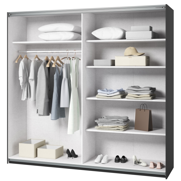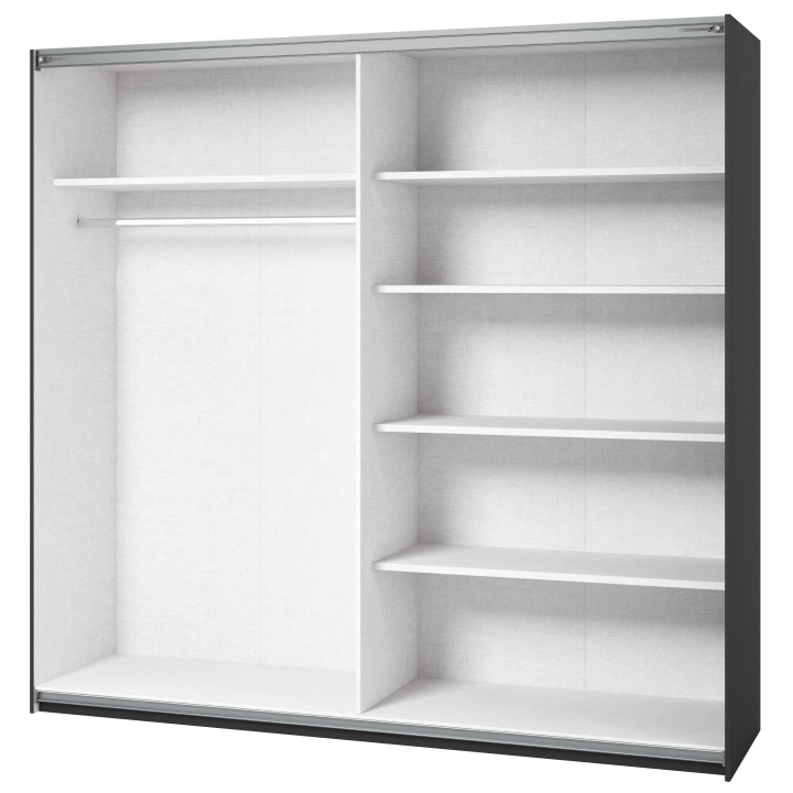 The Beta wardrobe by Helvetia is a piece of furniture that is ideal for those looking for a functional and space-saving piece of furniture. Its innovative sliding door mechanism saves space in the room while providing convenient access to stored items. This piece of furniture is not only practical, but also aesthetically pleasing through its minimalist design, large mirror and carefully finished details that add elegance and style to the interior. The functional wardrobe allows you to store clothes, shoes, accessories and other items in an organised and easily accessible manner.