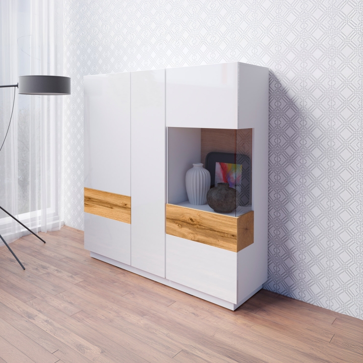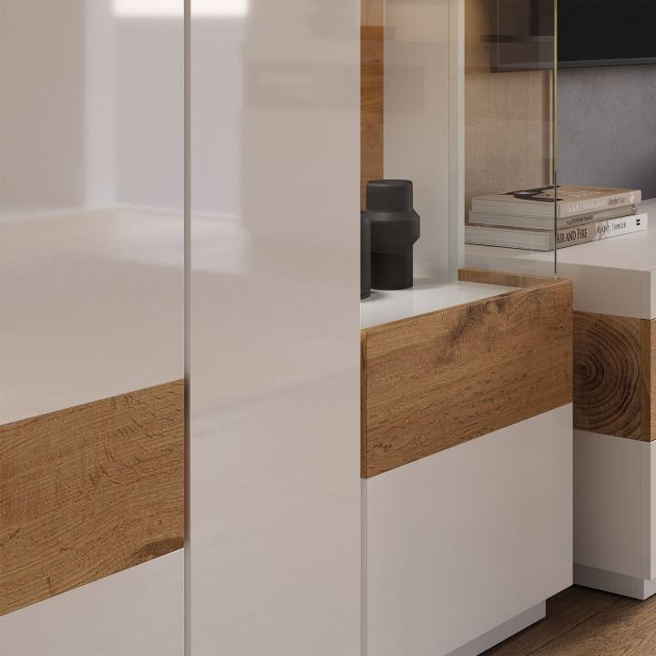 The furniture's dimensions are 130 cm wide, 139 cm high and 40 cm deep, which makes it fit easily into most arrangements. The furniture is made of furniture board and finished in matte and gloss, which emphasises the modern character of the collection. Glass elements add lightness, and the option to purchase lighting allows the contents to be even better displayed.