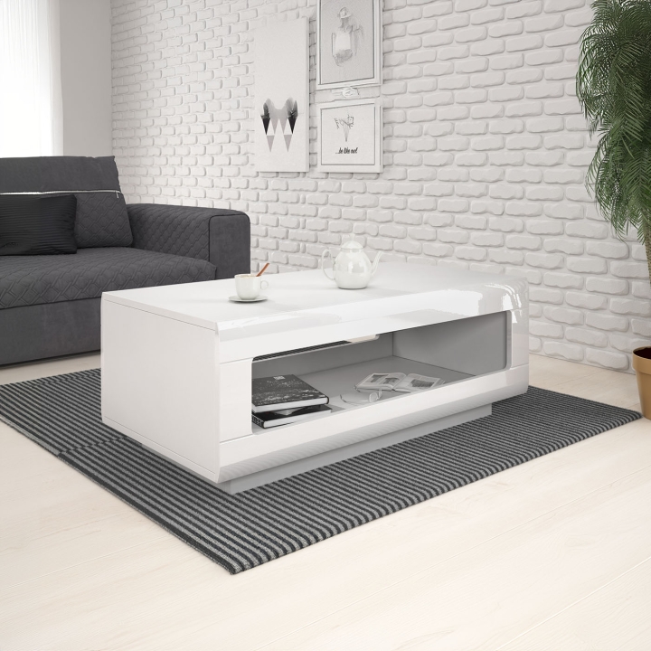 Under the table top there is an open shelf, which makes it easier to store small items and keep the lounge area tidy. Thanks to its subdued colours and simple shape, the table will easily fit into both minimalist and modern arrangements. It is an ideal choice for those looking for a white bench with a shelf, matching bright interiors.