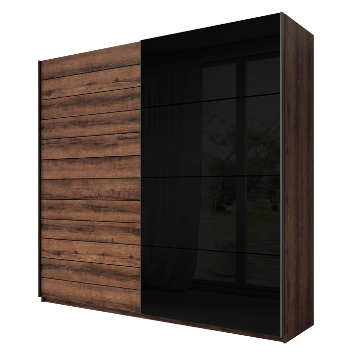 The GALAXY Type 68 sliding wardrobe combines modern aesthetics with a well-thought-out organisation of space. The front in black gloss décor has been juxtaposed with the lamellar décor of monastery oak, creating an expressive, contrasting layout. The black mirror finish of one of the panels acts as a subtle mirror, visually enlarging the interior. The solid construction is based on furniture board and MDF veneered with PVC foil.