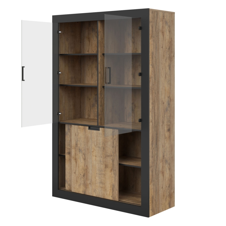 The Tudor 24WSNZ12 display cabinet is a piece of furniture measuring 120 cm wide, 187 cm high and 45 cm deep. It is made of furniture board in samdal oak décor, which reproduces dark wood with a clear grain and rustic character. The fronts are finished in the same veneer with a horizontal stripe in matt black - it runs across the entire width of the door, being a typical accent for the Tudor collection.
