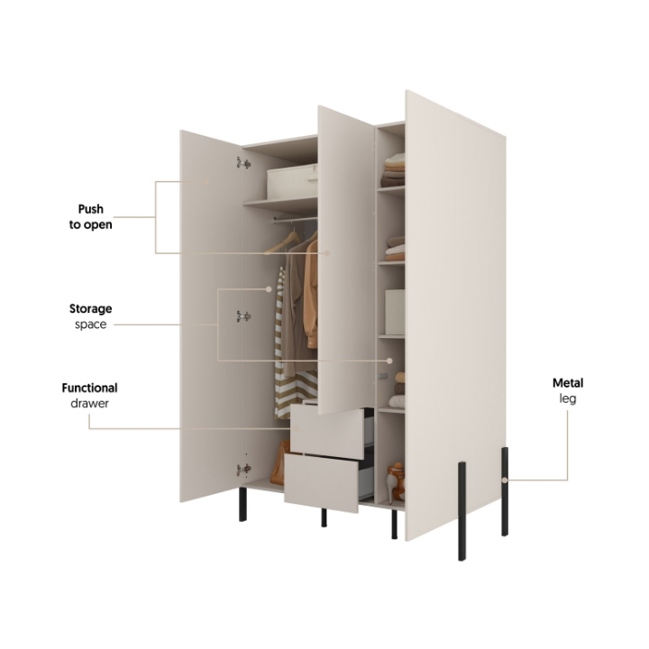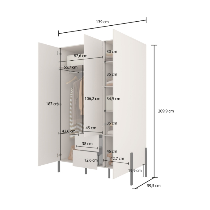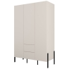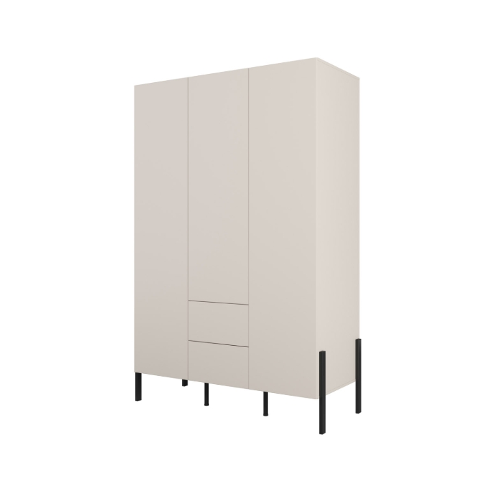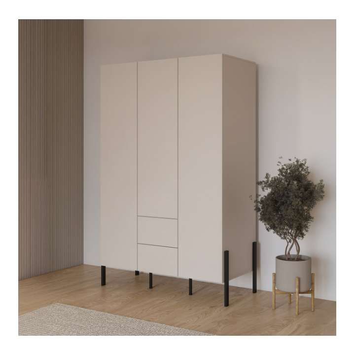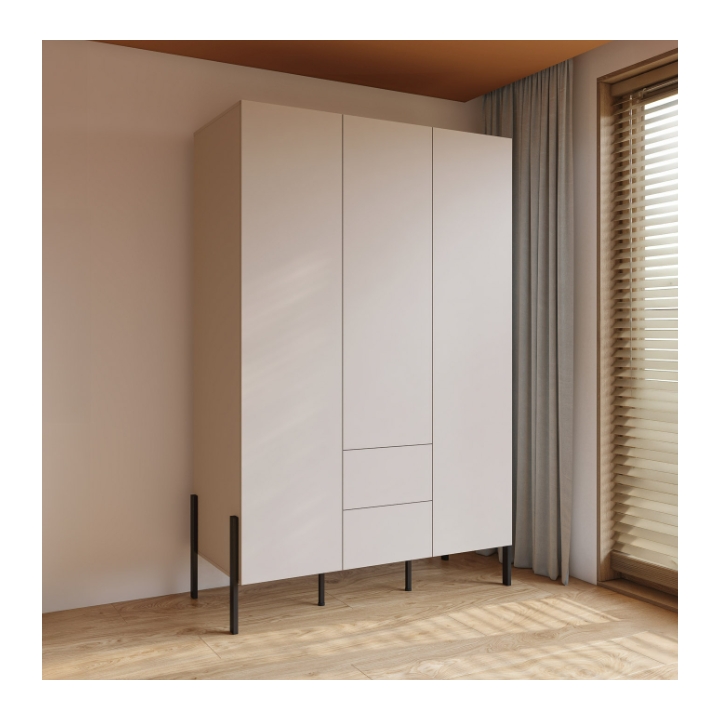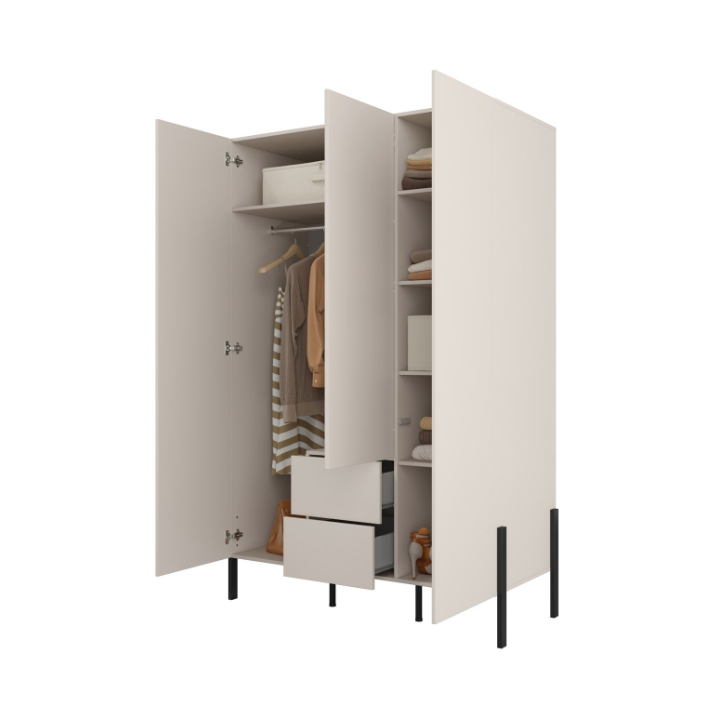 The Jukon 24KSND21 three-door wardrobe is 139 cm wide, 210 cm high and 60 cm deep. The structure is set on black, high metal legs that stably support the body of the furniture and raise it above the floor. This arrangement adds to the overall visual lightness, while also making it easier to clean underneath the furniture.