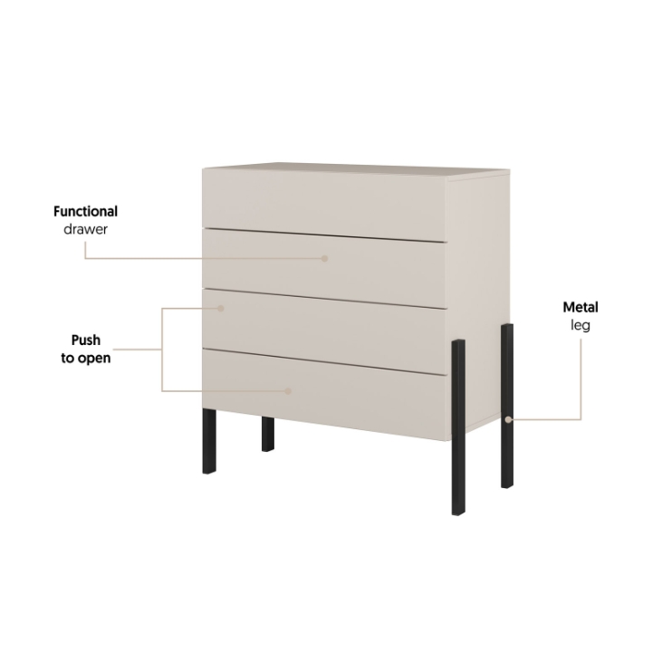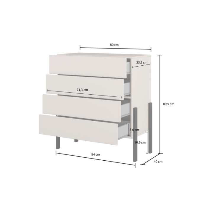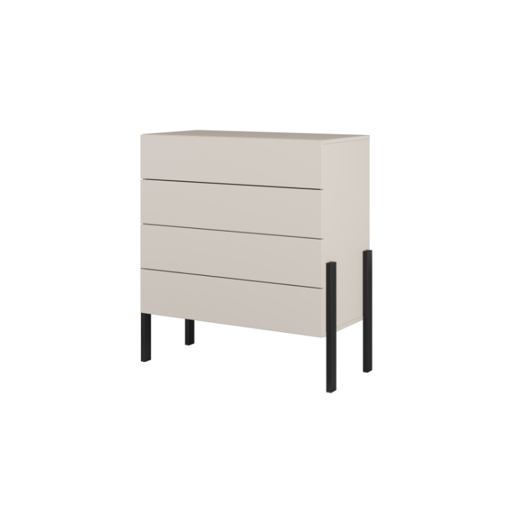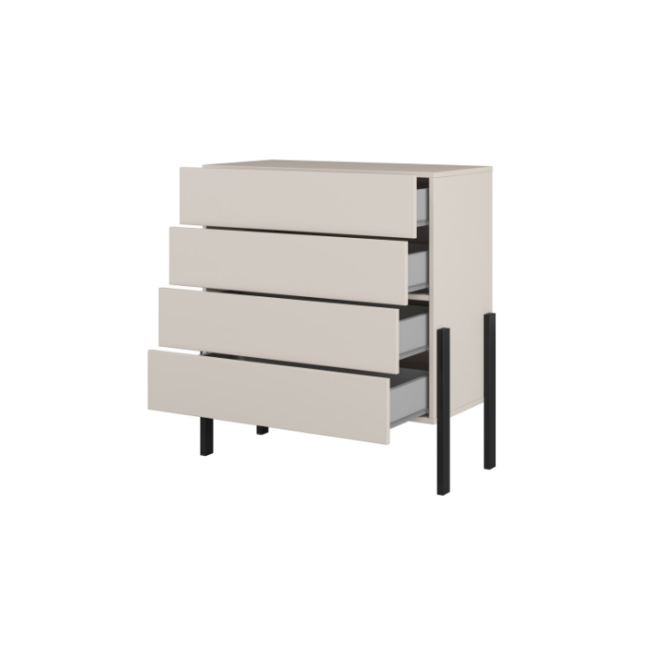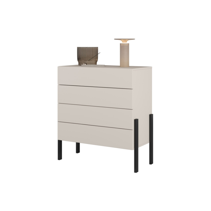 The Jukon 24KSND27 chest of drawers is a compact piece measuring 84 cm wide, 90 cm high and 40 cm deep. Thanks to its reduced width, it even fits into limited spaces such as corridors, alcoves or small lounge areas. The fronts and body are made in cashmere, which is characterised by a uniform, muted shade. The matt surface gives the furniture a uniform structure without gloss and without visible handles.