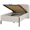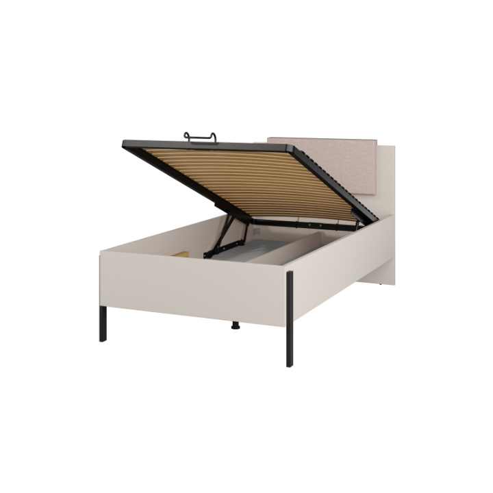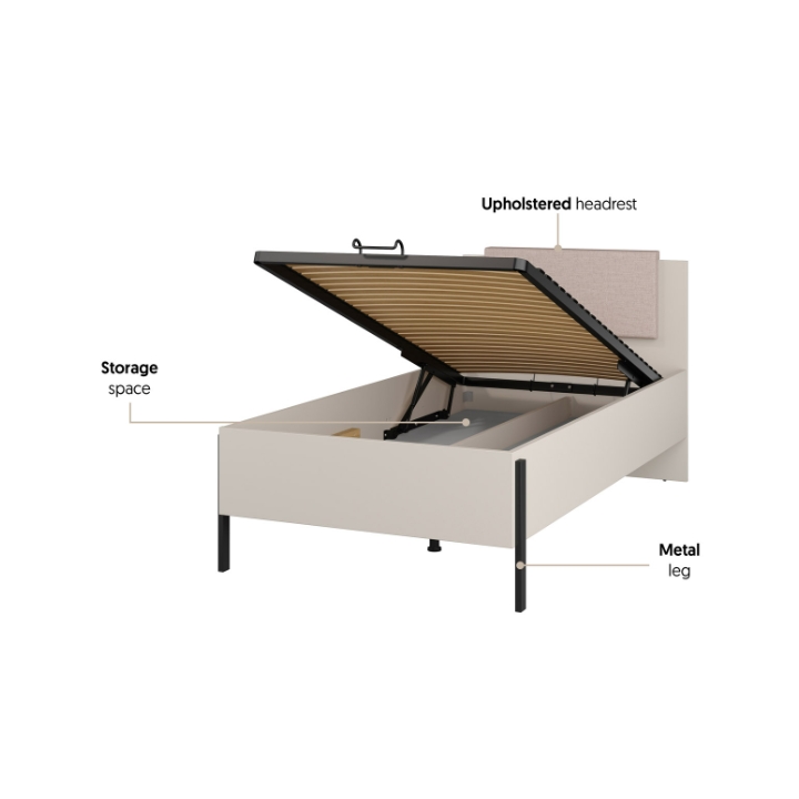 The furniture is equipped with a metal frame with gas lift and a container hidden under the entire sleeping surface. The sprung slatted cover provides flexible support for the mattress and, thanks to the opening mechanism, the user has easy access to the storage space - without having to move the bed. Spare duvets, bedding, seasonal clothes or other items that do not need to be stored on top will fit inside.