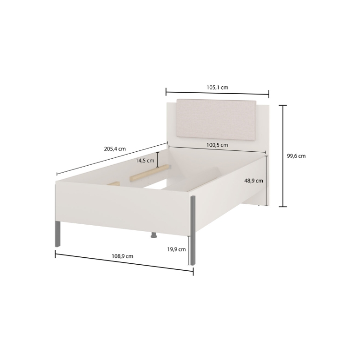 The Jukon 24KSND54 bed is a piece of furniture with a length of 205 cm, a width of 109 cm and a height of 100 cm. Designed for a 90 cm wide mattress, it provides a comfortable place to sleep for one person, for example in a youth room, guest room or studio.
