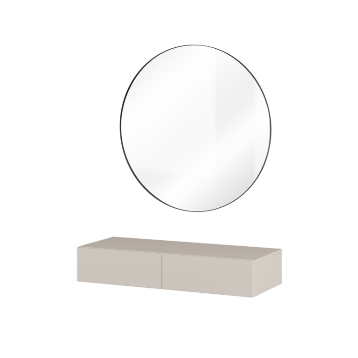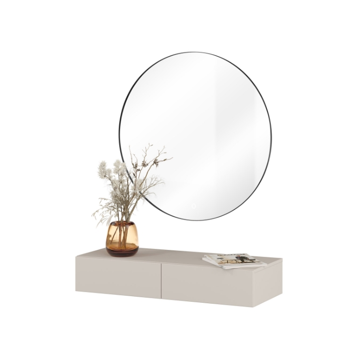 The Jukon 24KSND59 Hanging Toilette with Mirror is a small wall-mounted piece of furniture designed to save space and simplify the daily grooming area. This model combines a simple body measuring 90 cm wide, 16 cm high and 35 cm deep with a round mirror mounted directly above the top. This design means that the dressing table creates a tidy and ready-to-use focal point in the bedroom or dressing room, without the need for a separate mirror.