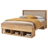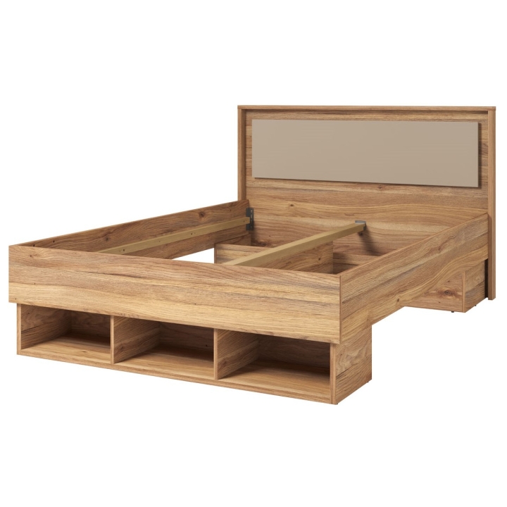 The bed is placed directly on a plinth. The lack of classical legs makes the furniture stick to the floor and creates a compact, settled silhouette. The sides of the bed and the footboard are smooth, without additional details or milling. The front and sides have a uniform grain direction, which emphasises the coherence of the design. The entire bed is made of furniture board finished in a natural wood imitation décor in a warm, broken shade of brown.