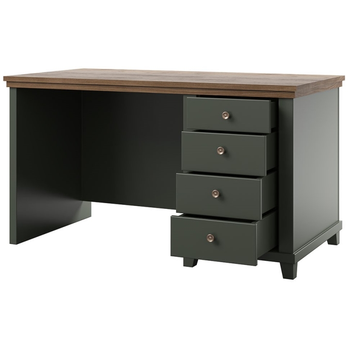 Desk Evora 4S Type 03 by Helvetia Wieruszów is a proposal dedicated to those who appreciate careful workmanship and expressive design. The juxtaposition of dark green with a decorative shade of oak lafkas gives the piece of furniture a character, which will perfectly find its place in spaces maintained in a classic arrangement. The Evora collection is created for interiors such as offices, living rooms and living rooms, where both aesthetics and solidity count.