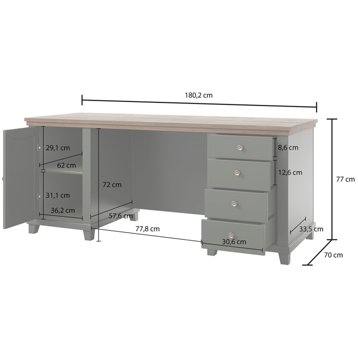 With a width of 180 cm, a height of 77 cm and a depth of 70 cm, the model offers a thoughtful storage layout. It includes a 1-door cabinet, 4 drawers and 2 shelves that allow for convenient placement of documents, office accessories or small appliances. All elements are arranged in a way that facilitates daily organization of work.