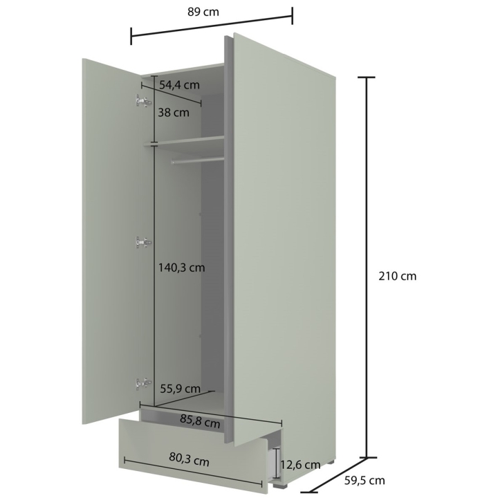 The dimensions of the closet have been carefully adjusted to provide enough storage space while maintaining a compact form. Its width is 89 cm, height is 210 cm, and depth is 60 cm. Thanks to these proportions, the model will work well in both larger and smaller rooms.