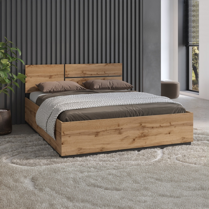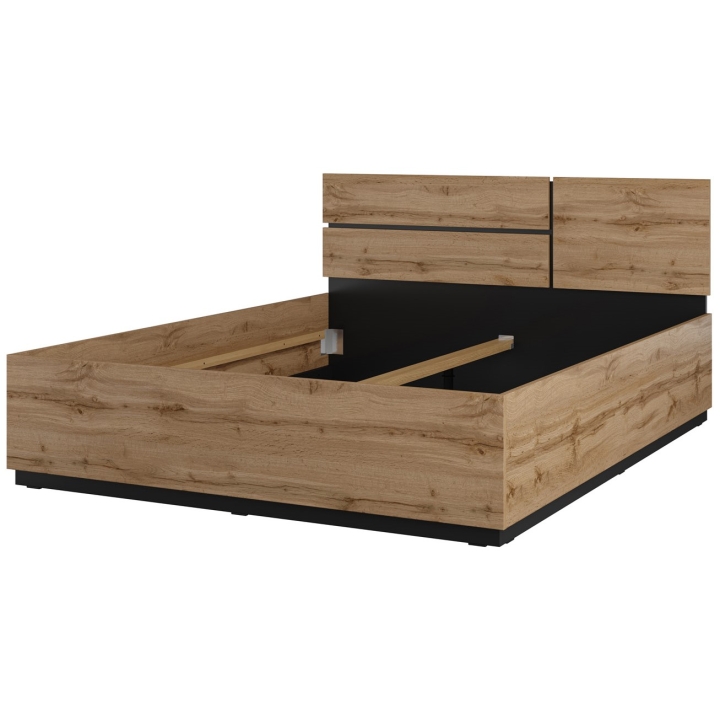 The 160 Cross S type 32 bed by Helvetia Wieruszów is a proposal for those looking for a solid piece of bedroom furniture. The structure was designed for comfortable use and durability, which is ensured by the use of laminated furniture board and careful finishing with ABS edges. The whole is based on low black legs, which give the whole a stable character.
