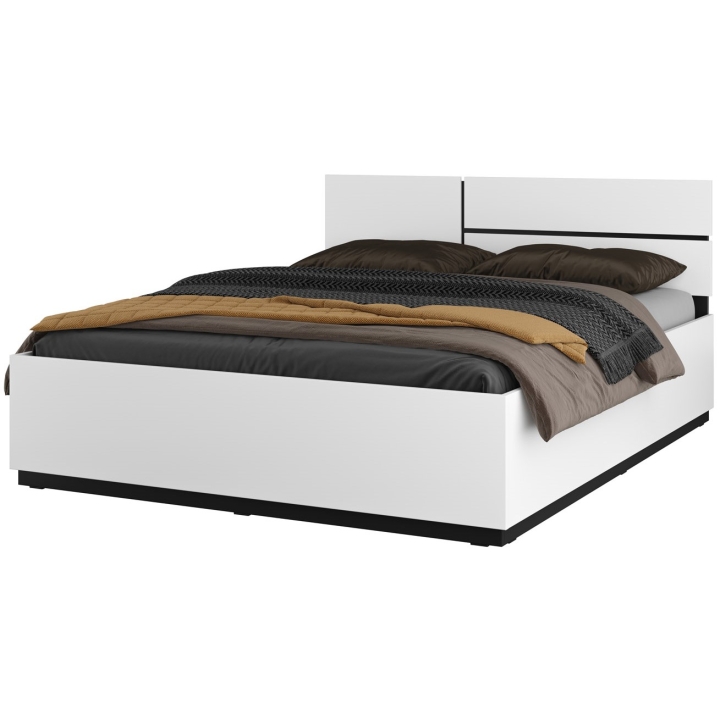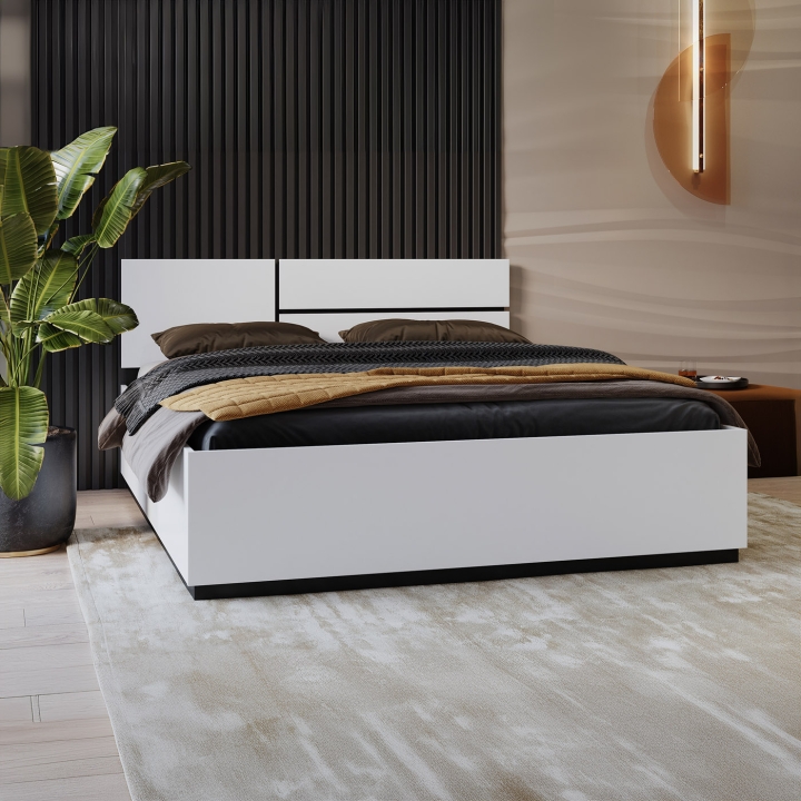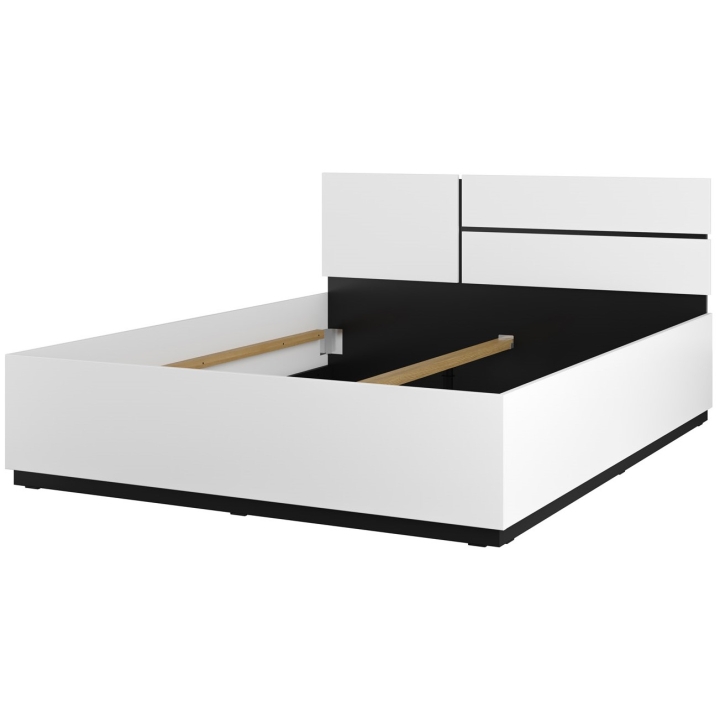 The 160 Cross S type 32 bed by Helvetia Wieruszów is a proposal for those looking for a solid piece of bedroom furniture. The structure was designed for comfortable use and durability, which is ensured by the use of laminated furniture board and careful finishing with ABS edges. The whole is based on low black legs, which give the whole a stable character.