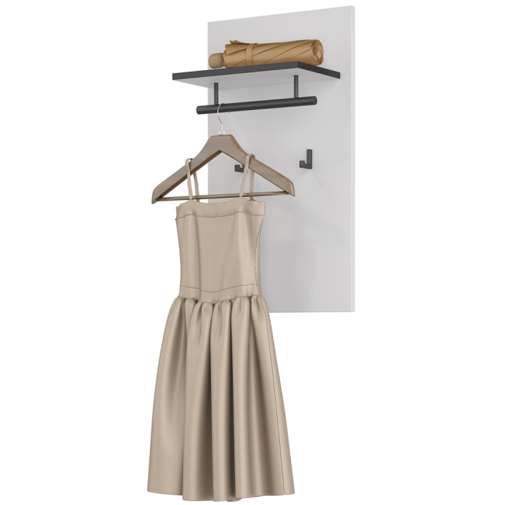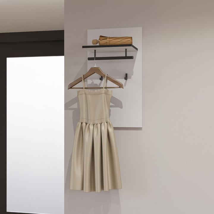 The model is equipped with one shelf, a bar and two hangers, which allows to organize both outer garments and smaller accessories. This makes the panel an organized place for the most frequently used closet items. The arrangement of the various parts was planned to ensure easy access to the stored items.