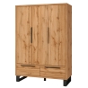 The Type 19 three-door closet from the Halle S collection by Helvetia is a proposal for those who appreciate expressive form in the spirit of loft. The juxtaposition of black with the shade of wotan oak with a strongly outlined grain creates an interesting contrast, in which the natural beauty of the wood is highlighted by a raw metal accent.