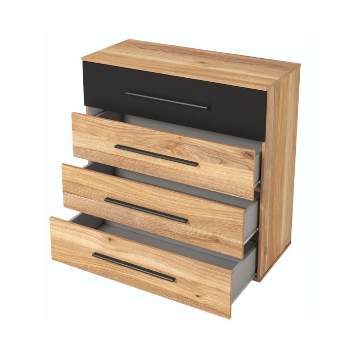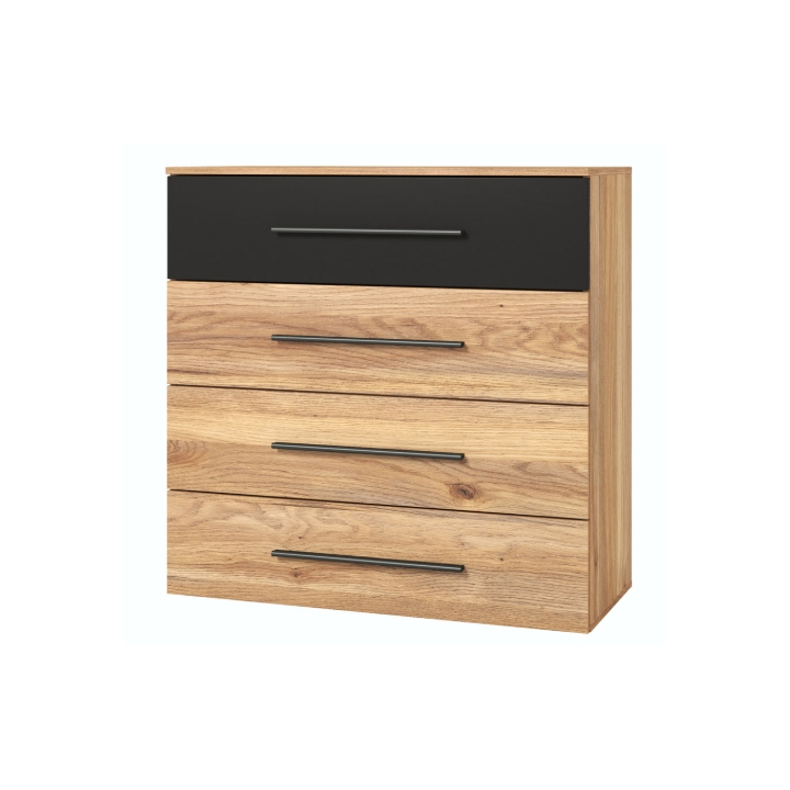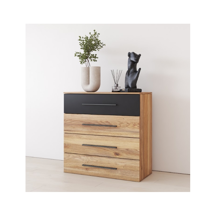 The construction of the chest of drawers is based on a solid furniture board, resistant to daily use. This material makes the whole characterized by longevity and resistance to damage. Complemented by plastic handles in black, which emphasize the whole.