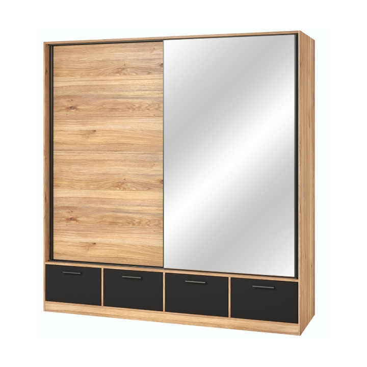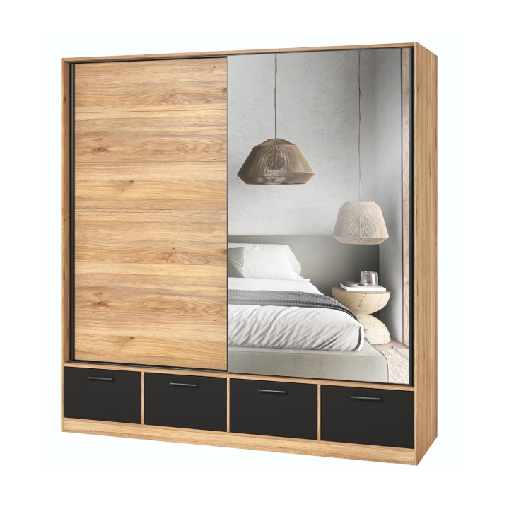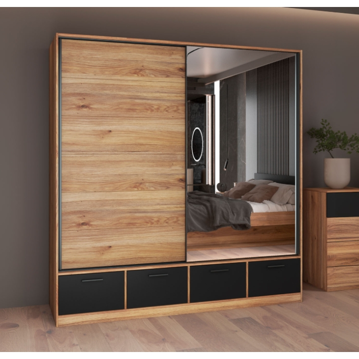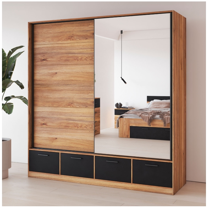The Beta Type 63 closet by Helvetia Wieruszów is a proposal addressed to people who expect order and comfort during everyday use of their home space. Its impressive design with sliding doors and a mirror on the front not only provides comfortable space for a closet, but also subtly enlarges the interior visually. The combination of the Mauvella oak color with black adds clarity to the whole and warms the atmosphere of the room.
