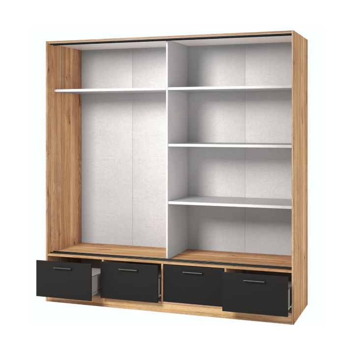 The dimensions of the closet are 200 cm wide, 209 cm high and 61 cm deep, which makes it offer considerable storage space. Inside it there are 4 spacious shelves, which allow clear segregation of clothes and accessories. In addition, in the lower part there are 4 drawers, ideal for small closet items that require special organization.