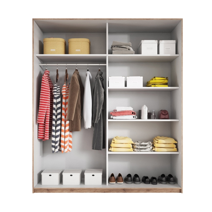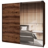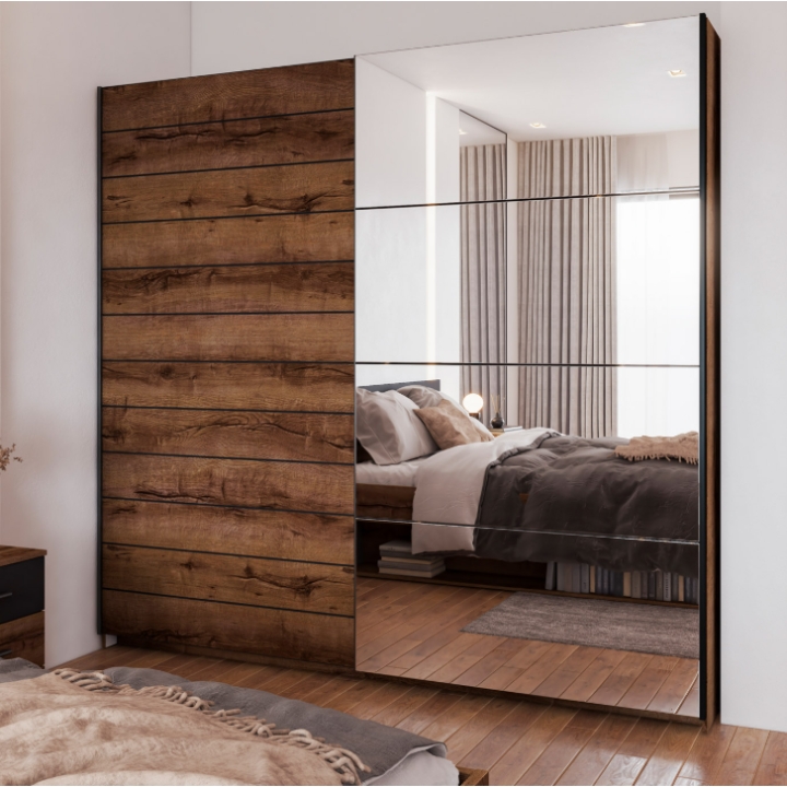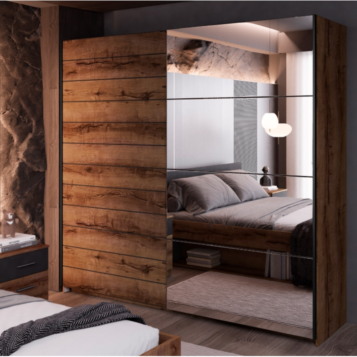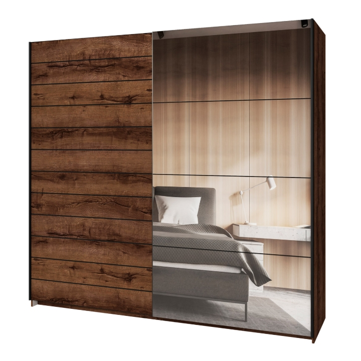The Beta Type 78 closet by Helvetia Wieruszów is a spacious proposal of equipment, which, thanks to sliding doors and the presence of a mirror on the front, becomes not only a capacious storage place, but also a striking element of the interior. Its surface in the coloration of deep Monastery Oak gives the room a warm and refined character. It is a solution that allows you to keep things in order and at the same time emphasize the atmosphere of the arrangement.