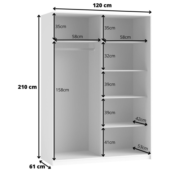 The structure of the furniture has a width of 150 cm, a height of 210 cm and a depth of 61 cm, which makes it a spacious closet storage. Inside there are 5 shelves, which are conducive to a clear arrangement of clothing and accessories. The whole is complemented by a bar, on which you can hang clothes that require proper arrangement.