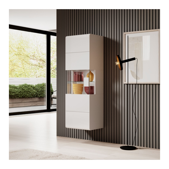The cabinet makes it possible not only to organize household items, but also to display decorations or collections. This effect can be enhanced by using a dedicated LED panel, which will illuminate the interior of the furniture and give the space a moody atmosphere.