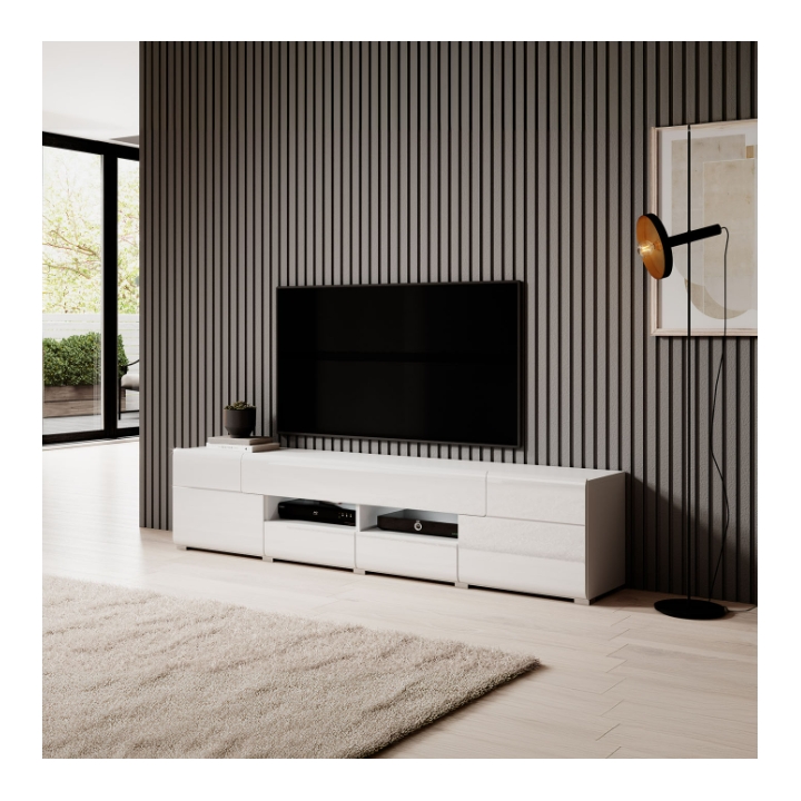 The design of the cabinet is 208 cm wide, 47 cm high and 39 cm deep, which allows for easy storage of many accessories. Two doors are placed on the sides, and the center is enhanced with one long drawer. Directly below it are two small open spaces, just in time for a set-top box or player, and the whole is completed by two additional drawers at the bottom.