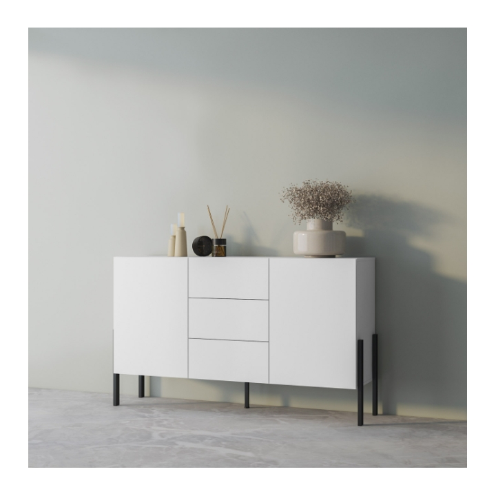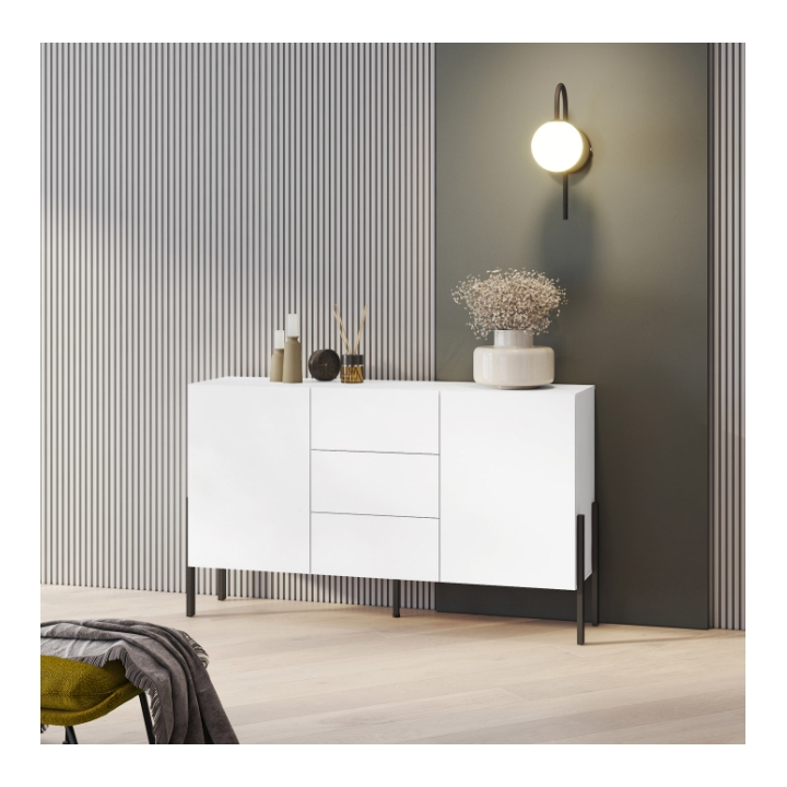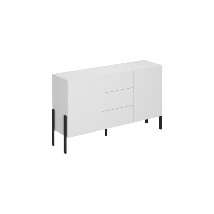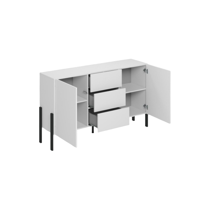 The black metal legs are welded to the frame in a way that allows the dresser to be stably supported along its entire length. Their height provides convenient access under the furniture in case of cleaning. The materials used allow for domestic use - the surfaces of the fronts and tops can be cleaned with standard furniture cleaners.