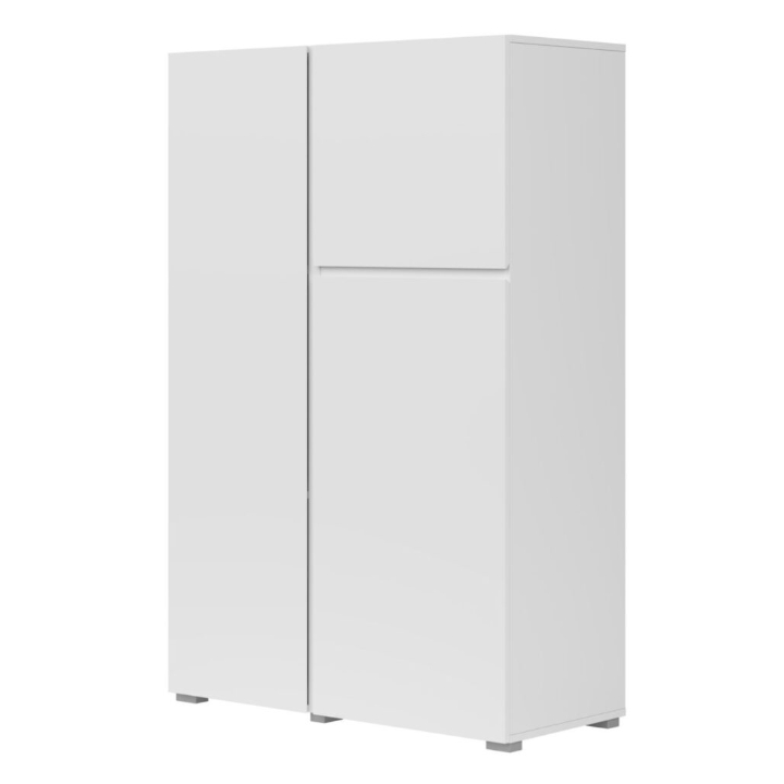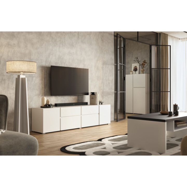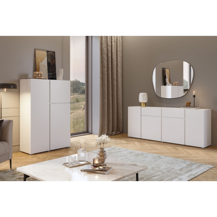 The structure is supported by slim black metal legs, which provide stability while also allowing for easy cleaning underneath the cabinet. The matte front finish makes the surfaces easy to clean and maintain.