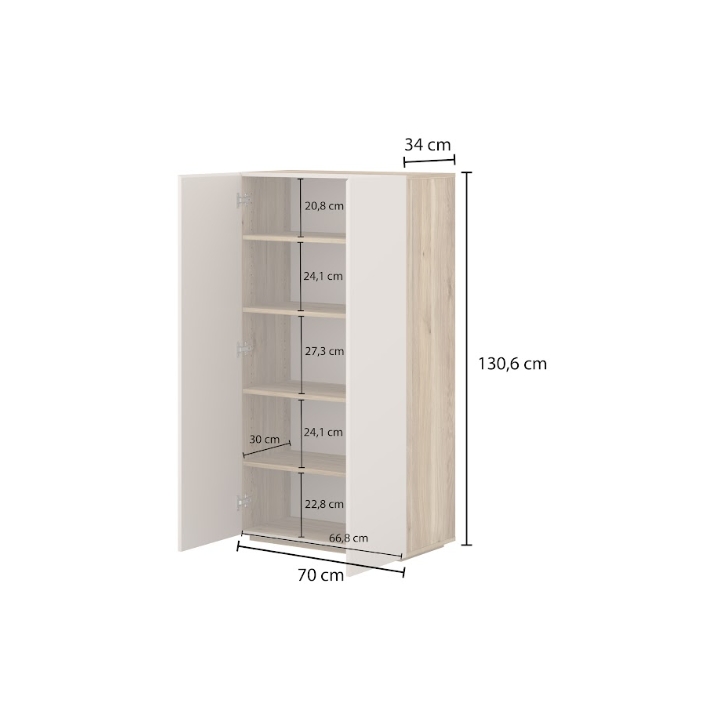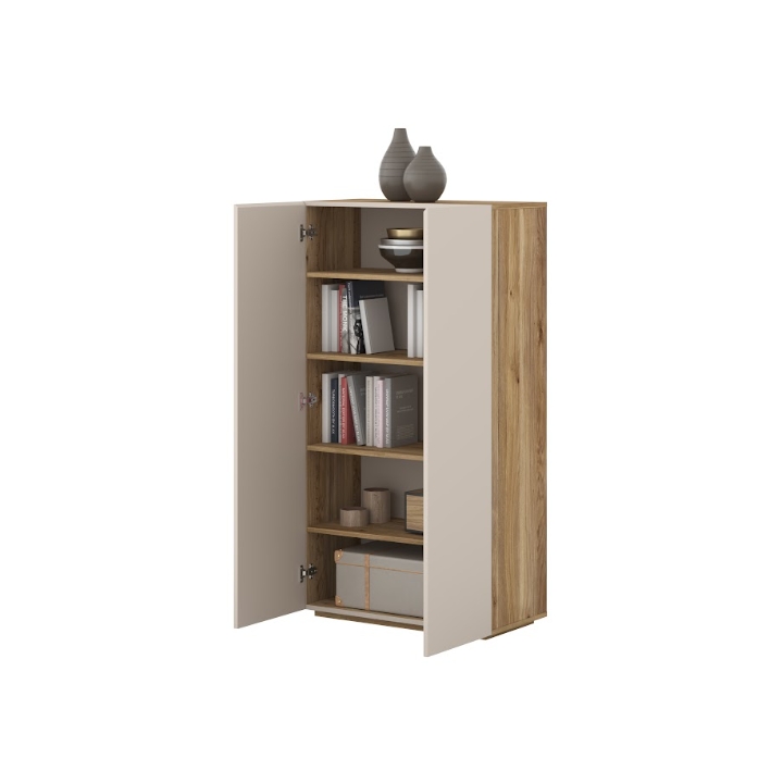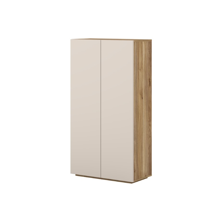 The Criss Type 42 chest of drawers is a tall, two-door piece of furniture with a width of 70 cm, a height of 130.6 cm, and a depth of 34 cm. Thanks to its vertical design and slim depth, the cabinet takes up little floor space while offering a large amount of vertical storage capacity. The combination of cashmere-colored fronts with a top in a natural oak shade gives the unit a modern and elegant appearance.