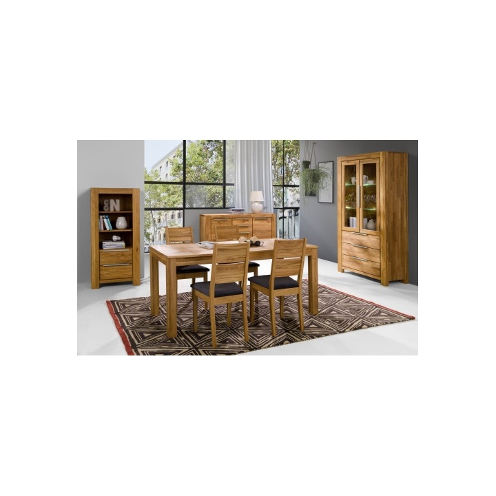 The Nena 2D3S oak sideboard by Meble Hugon, measuring 86 cm in height, 175 cm in width, and 45 cm in depth, showcases a design built on the natural character of oak and a careful combination of solid wood with veneered components. The front, drawers, doors, and legs are made from solid oak, while the shelves, dividers, and side panels are crafted from oak-veneered board, faithfully reflecting the structure of natural wood.