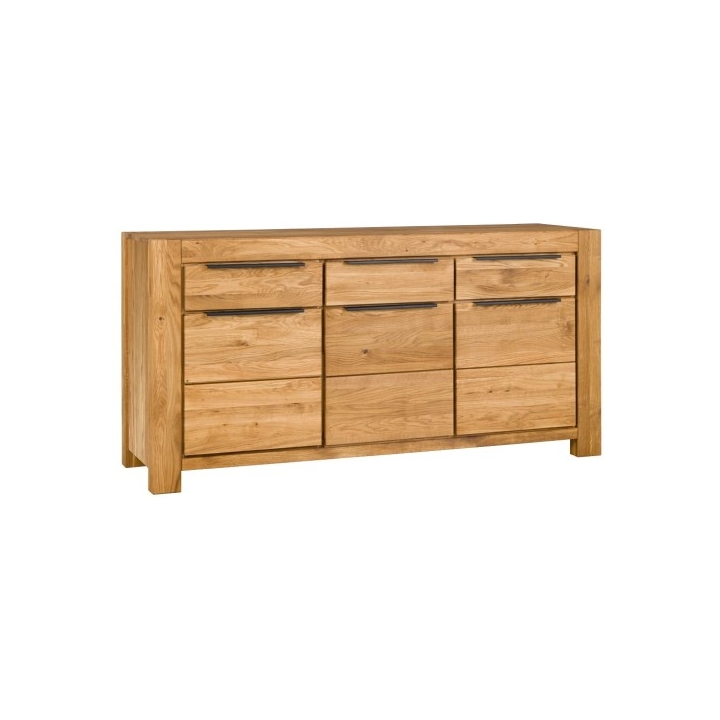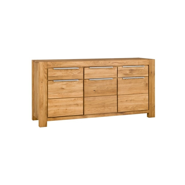 The surface is oiled, bringing out the natural grain pattern and giving each component its own distinct look. The sideboard consists of three spacious cabinets with full wooden doors and three centrally placed drawers. This layout provides versatile storage options—perfect for bedroom clothing, living-room accessories and textiles, or tableware and cutlery in the dining room.