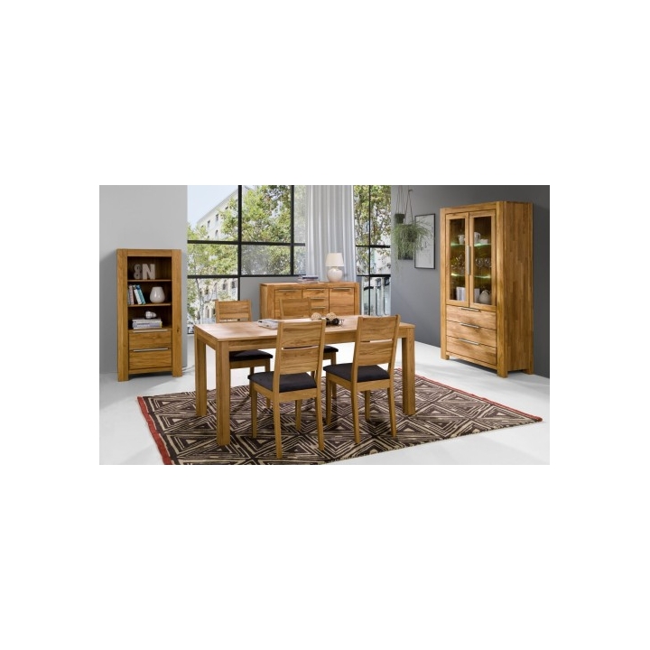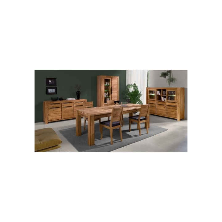 The Nena 3D3S oak sideboard by Meble Hugon, measuring 86 cm in height, 175 cm in width, and 45 cm in depth, is designed to highlight the natural properties of oak and the durability of solid wood. The fronts, drawers, and doors are made from solid oak, while the shelves, dividers, and side panels are crafted from oak-veneered board, preserving a cohesive appearance and a bold wood structure.