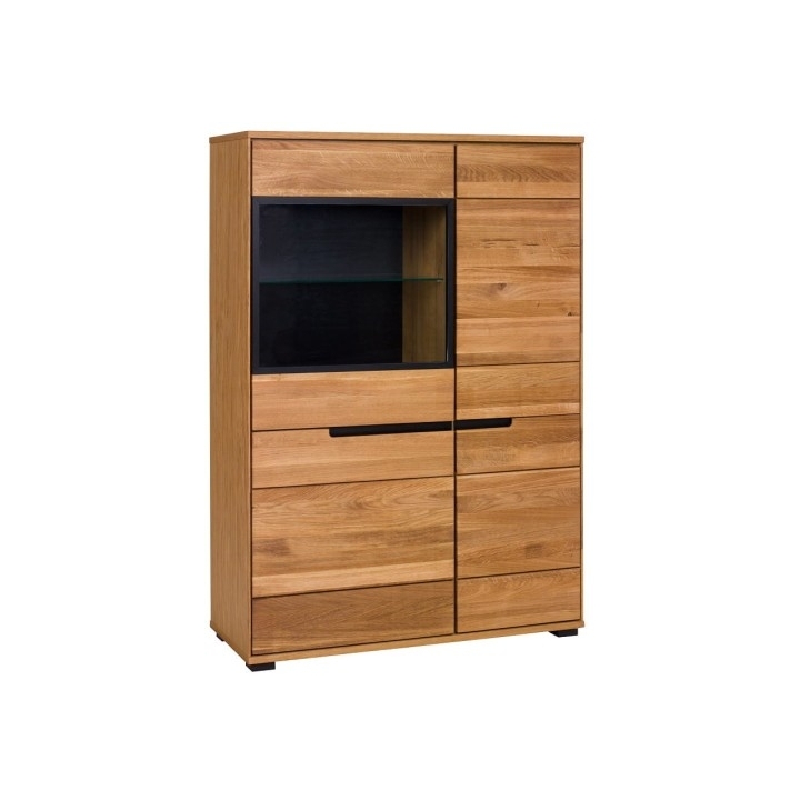 The Lola 4D Display Cabinet by Meble Hugon, measuring 146 cm in height, 102 cm in width and 40 cm in depth, is designed to combine display functionality with convenient storage while maintaining the natural look of oak wood. The fronts are made from solid oak, and the body is crafted from veneered board, resulting in a cohesive wood-grain pattern and a warm, natural appearance.