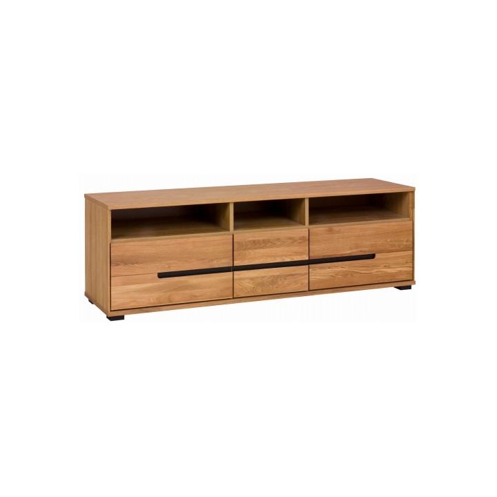 The Lola TV Cabinet 3D by Meble Hugon, measuring 52 cm in height, 162 cm in width and 40 cm in depth, is designed to provide a functional and well-organised space for multimedia equipment. The fronts are crafted from solid oak, showcasing a distinctive wood grain, while the body is made from veneered board, giving the furniture a cohesive appearance.